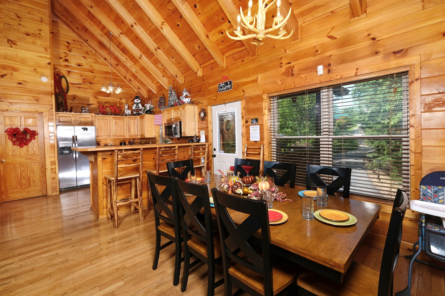 The dining area consists of a solid wood dining table with antler chandelier hanging above. The table seats 8, the bar area seats 4, and then there is another round table adjacent to the Christmas tree which seats 4.