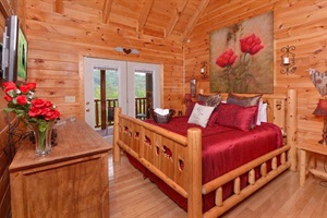 VALENTINES ROOM: You'll see love is in the air when you walk into this lovely king bedroom, with private bathroom, featuring a memory foam mattress, oval tub and shower, vaulted ceilings, ceiling fan, 42 inch flat screen TV with Direct TV and DVD player. This room is upstairs and there is deck access out the french doors, and the beautiful screened-in fireplace area with views of the surrounding mountains.