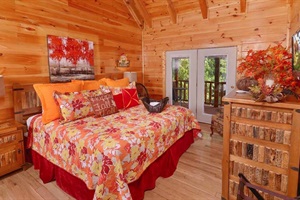 AUTUMN ROOM: If Fall is your favorite time of year, then you'll enjoy this festive room featuring pumpkins, leaves, scarecrows, turkeys and more! This room offers a king bed with memory foam mattress, private bathroom with oval tub and shower, vaulted ceilings, ceiling fan, 42 inch TV, with DVD player and Direct TV. With an upstairs location, you'll have deck access right outside your french doors to lovely views of the Smoky Mountains!
