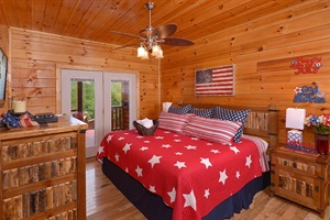 FOURTH OF JULY ROOM: You'll feel fireworks when you enter our patriotic themed room complete with American flag and Uncle Sam decor! Featuring a king bed, with memory foam mattress, private bathroom with oval tub and shower, ceiling fan, and 42 inch flat screen TV with DVD player and Direct TV. Located on the lower level, this room is just adjacent to the game area.