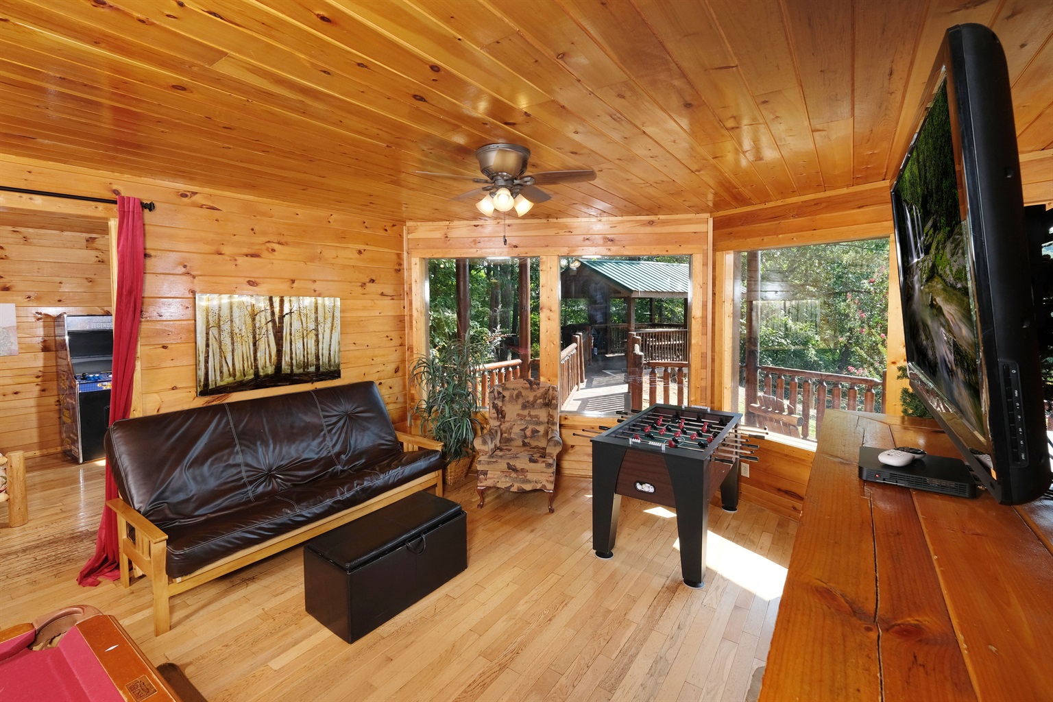 BUNK ROOM: Just off of our game room is our brand new twin over full log bunk bed (not pictured yet). This room is a separate room with a curtain for privacy. One of our two arcade machines is in the corner.